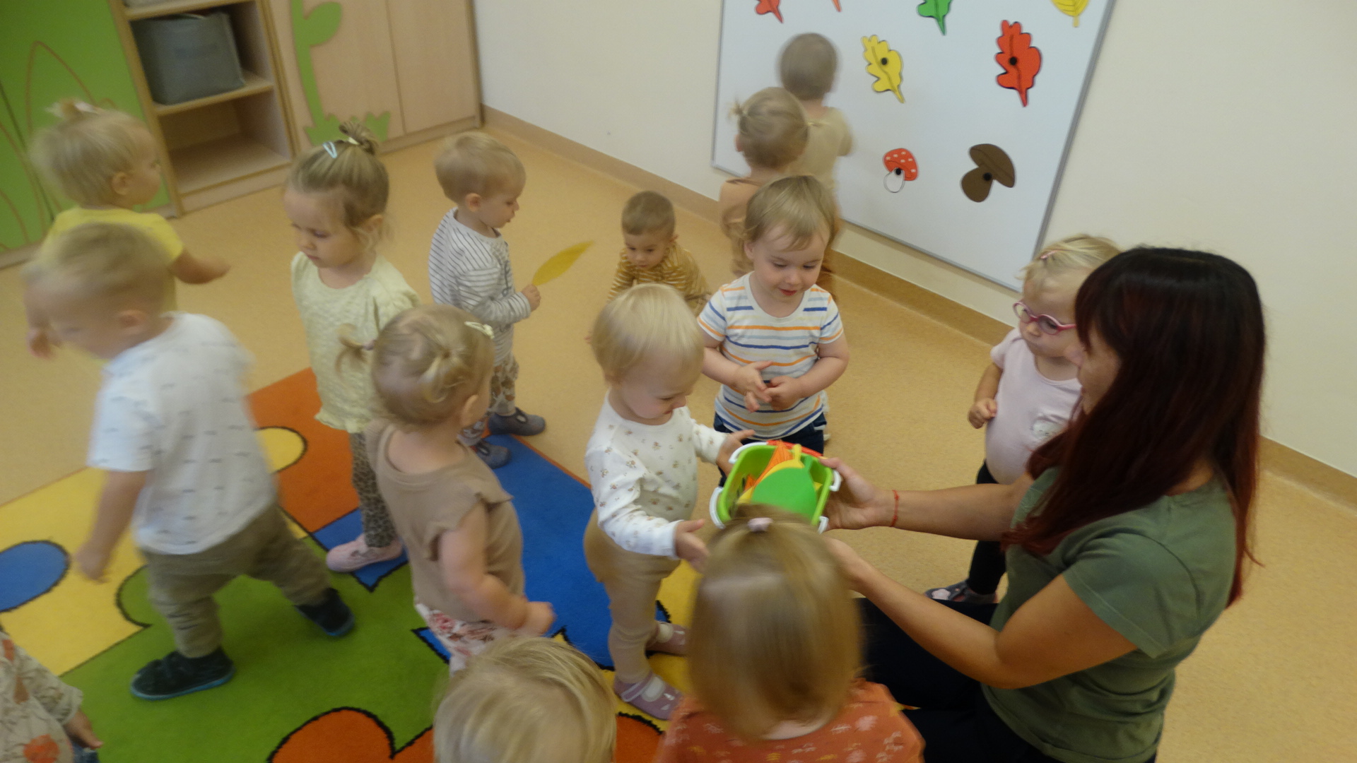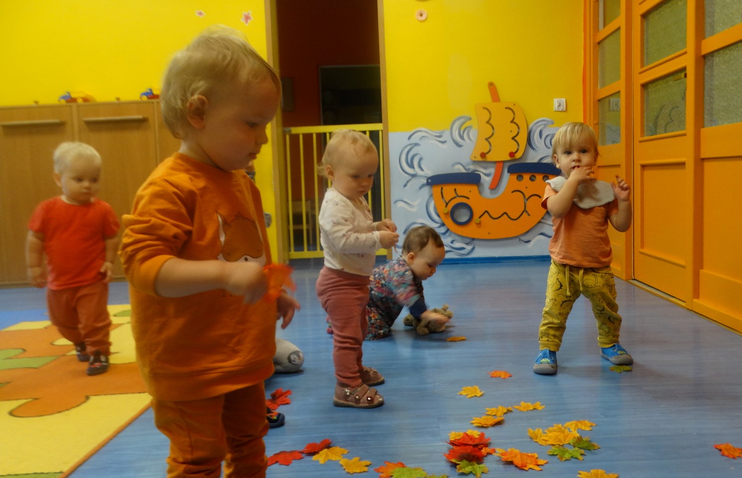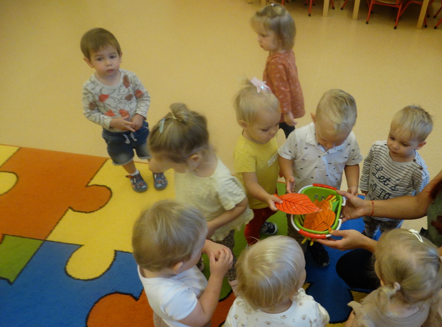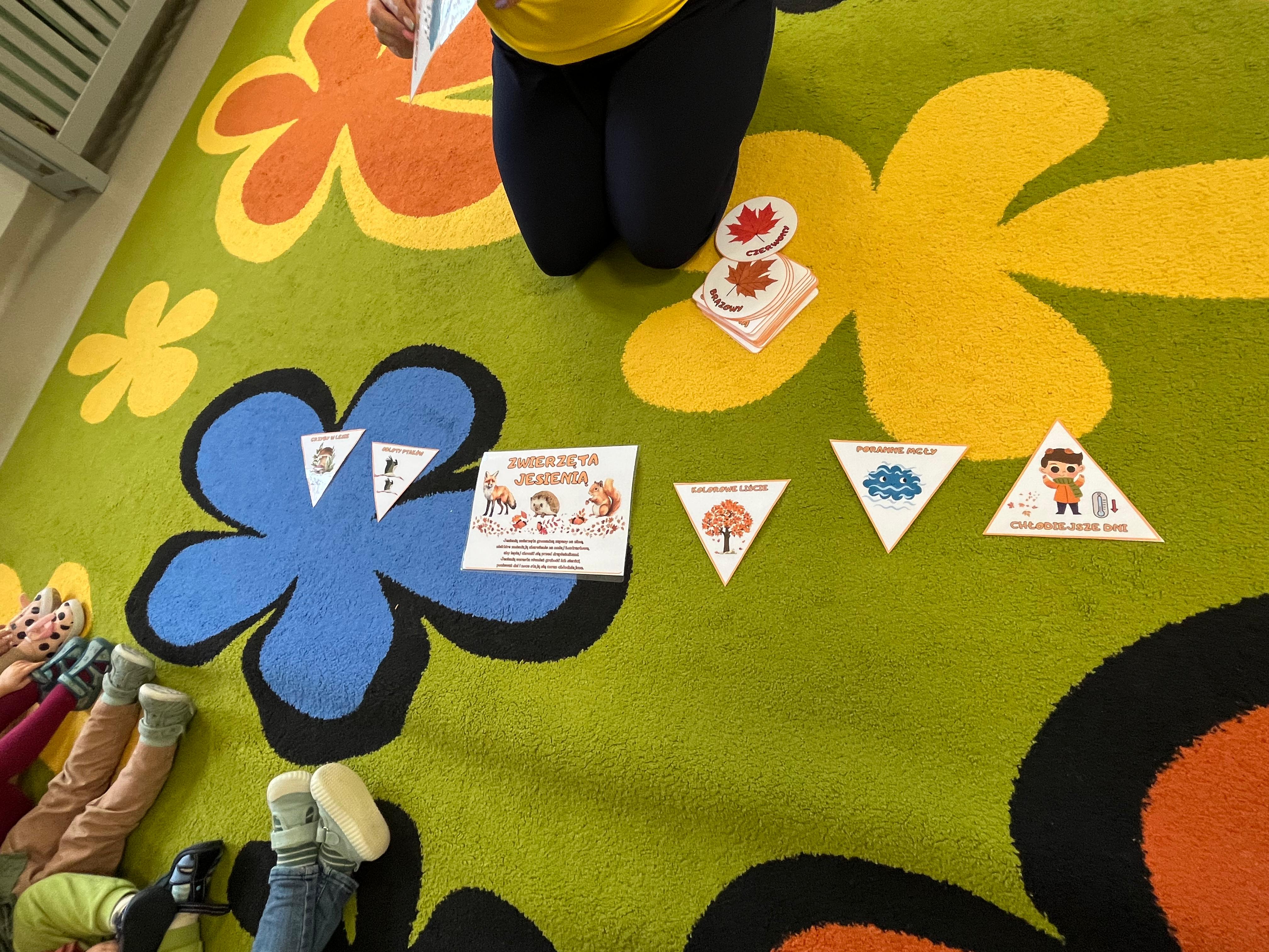 Kolorowe listki opadają w dół.