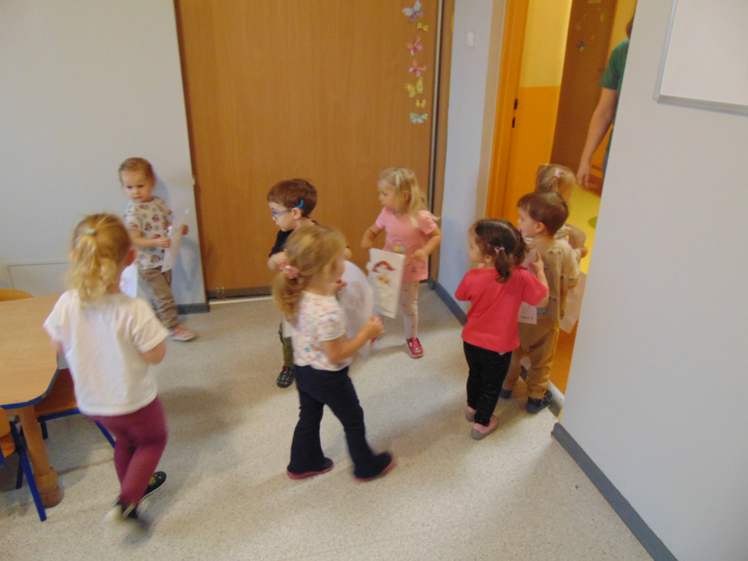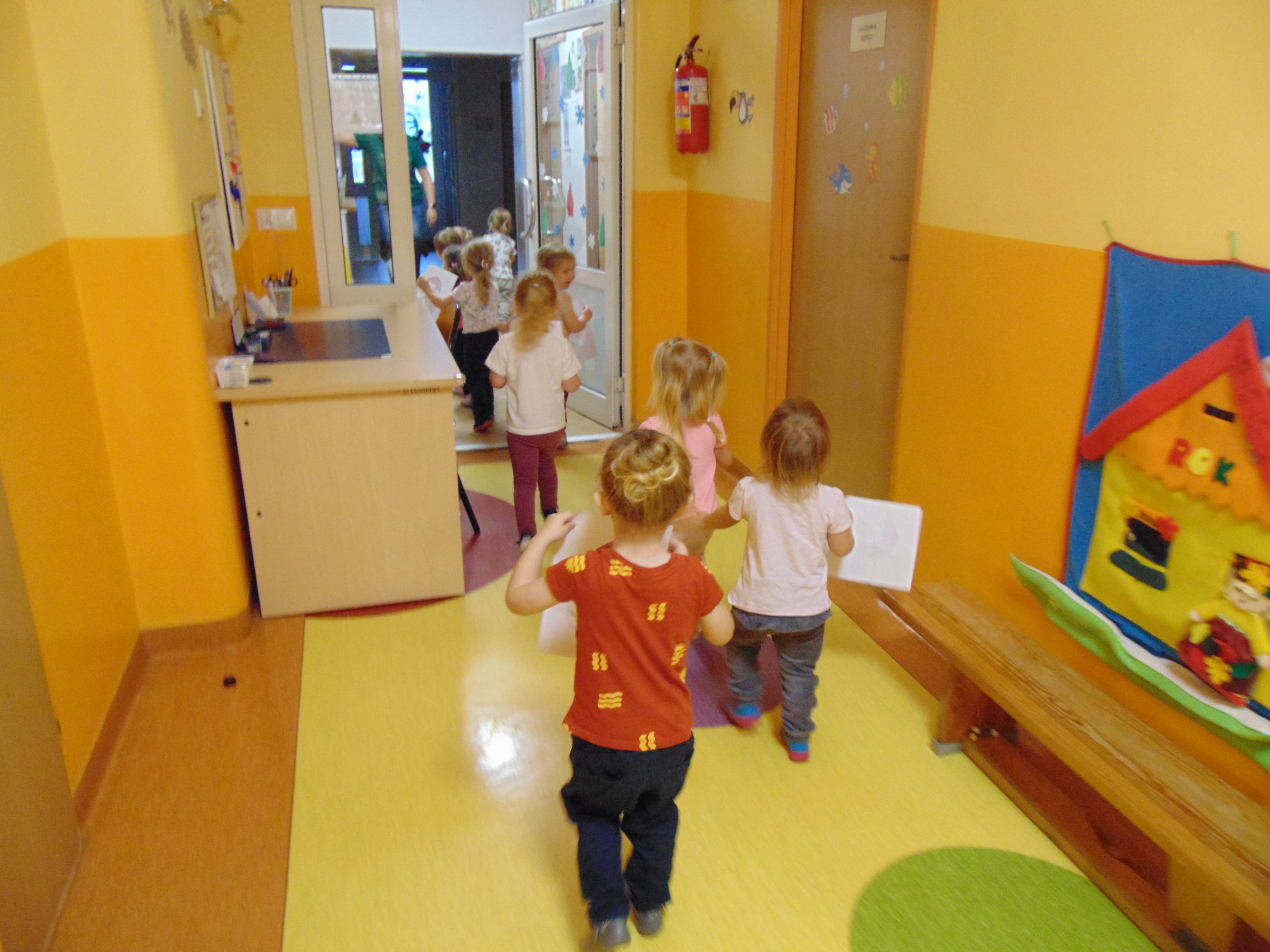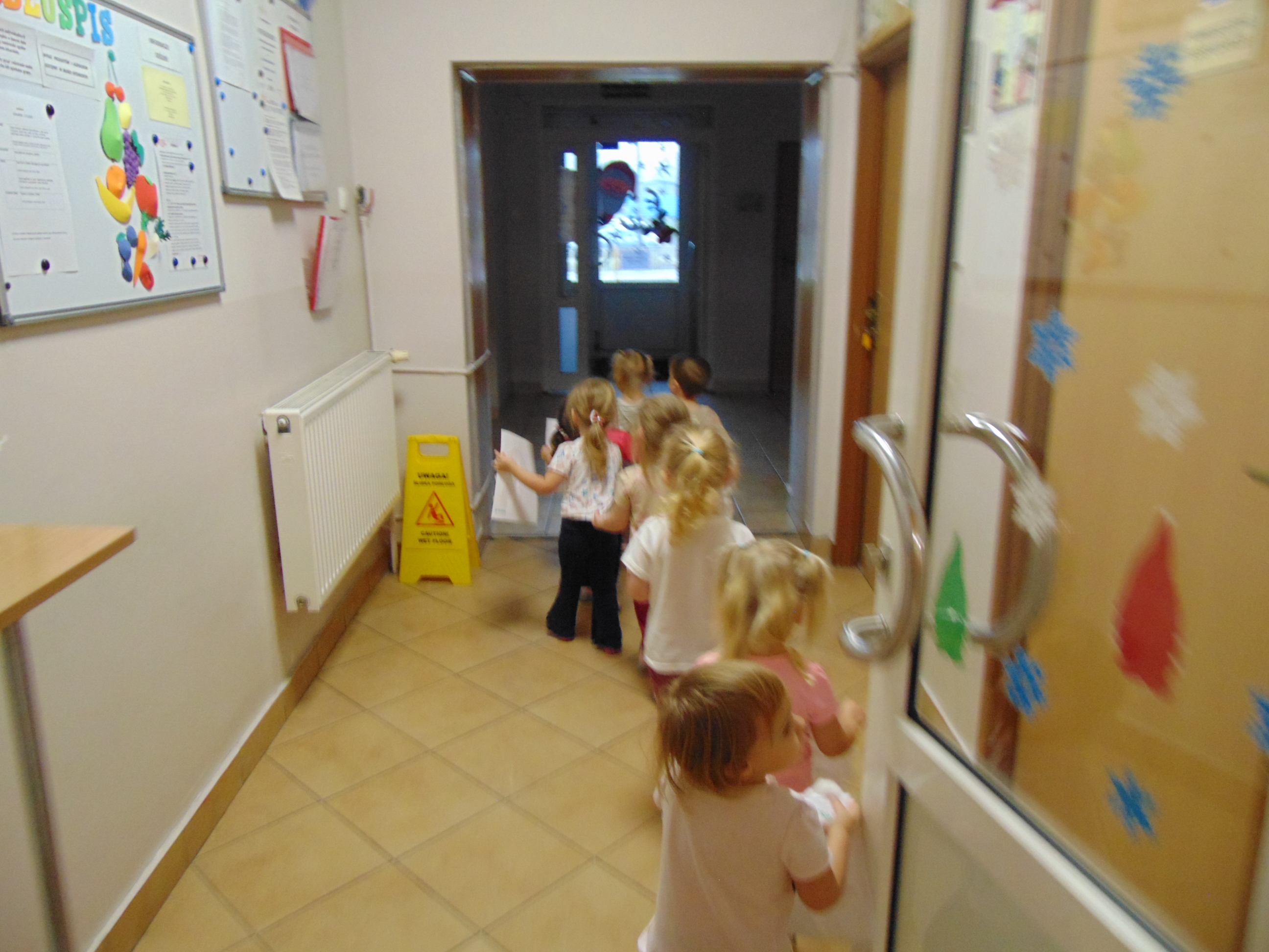Idąc korytarzem słychać świąteczne piosenki, dźwiek dzwonków i radosny śmiech dzieci.