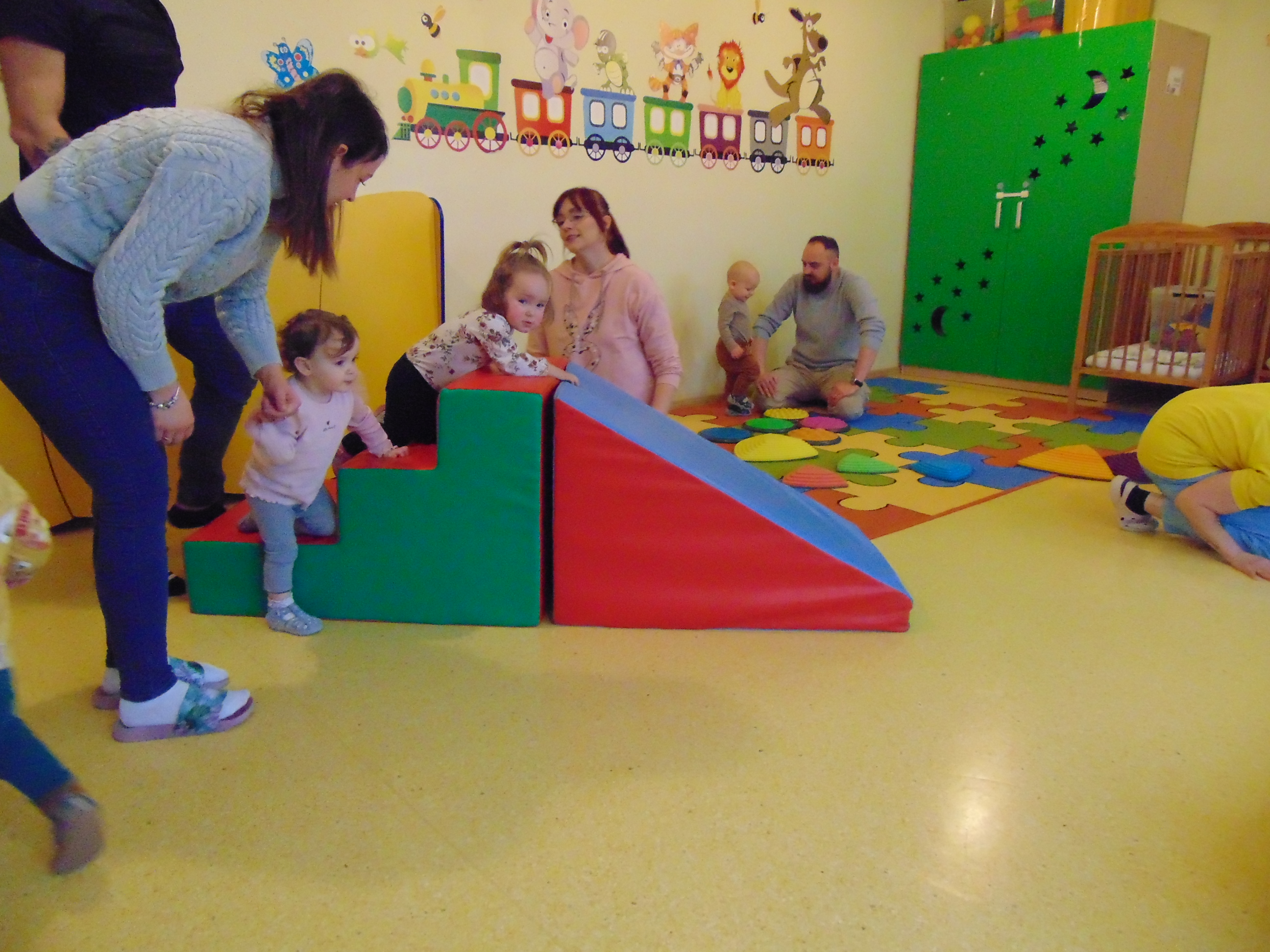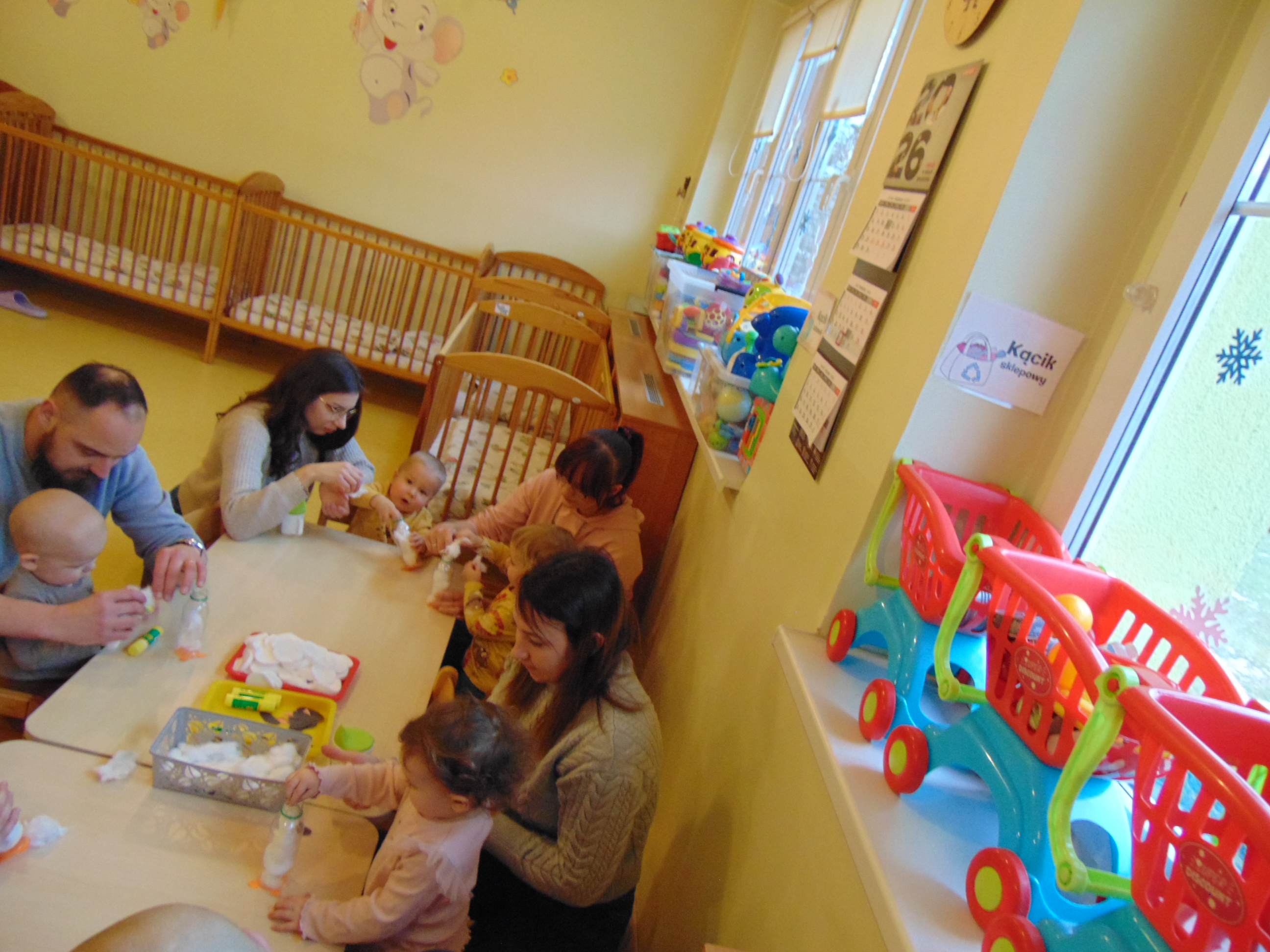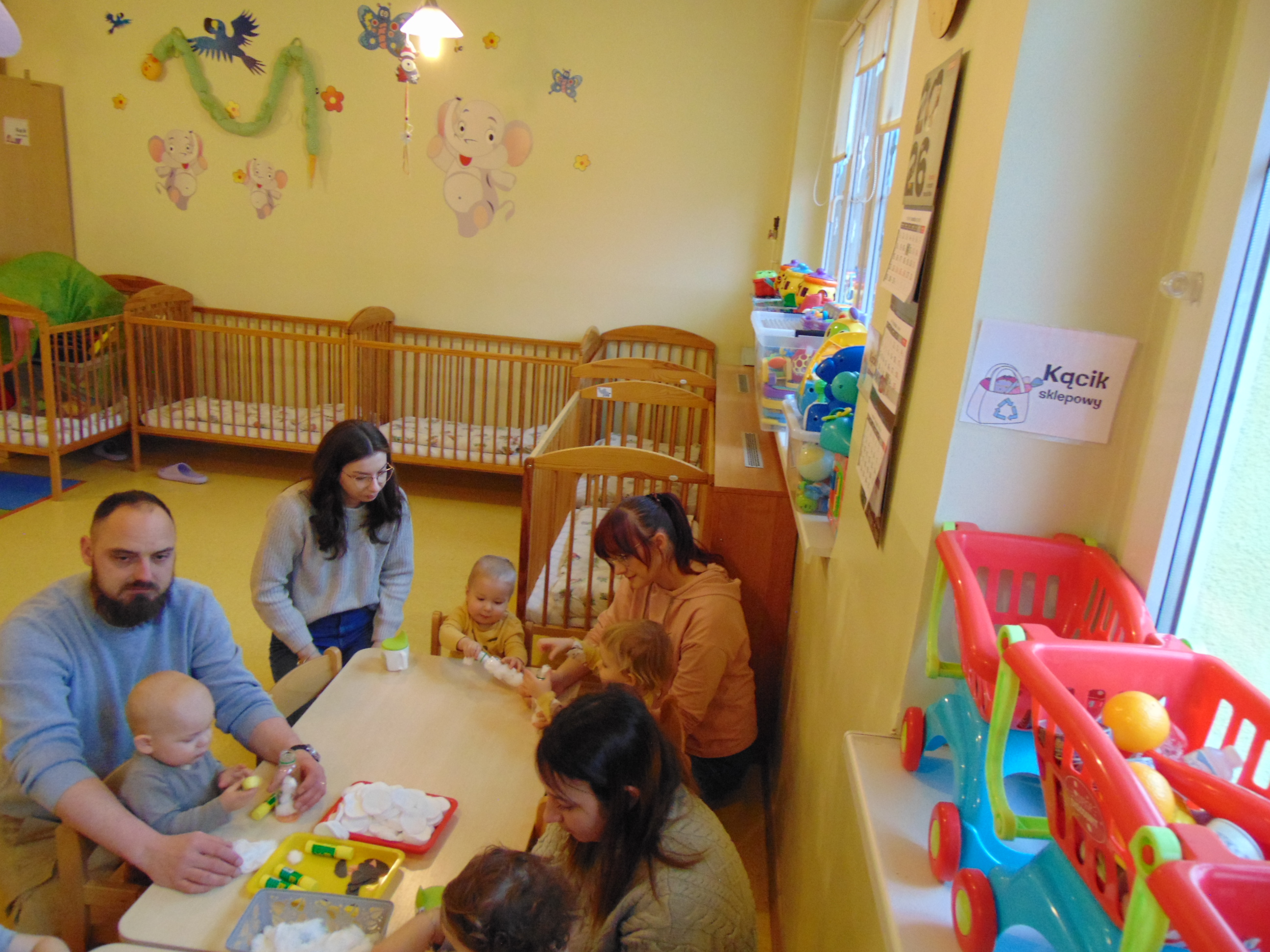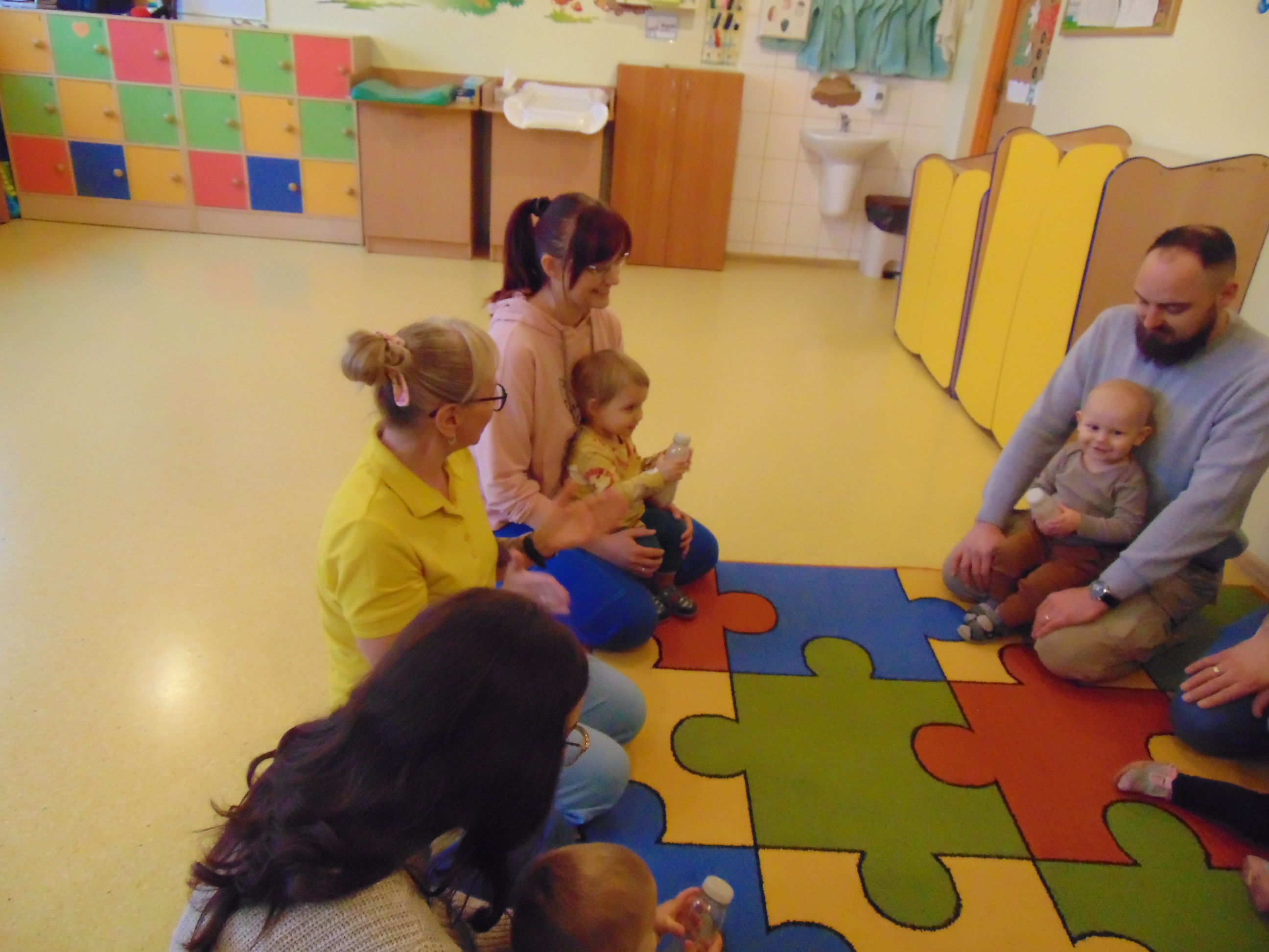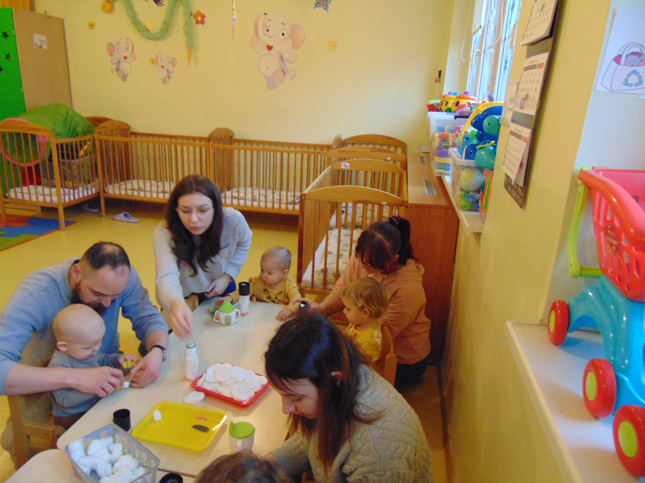 Podczas zajęć rodzice mieli możliwość towarzyszeniu swojemu dziecku podczas zajęć mając na celu zbudowanie radości ze wspólnego działania i poznania rytmu codziennego dnia w żłobku.